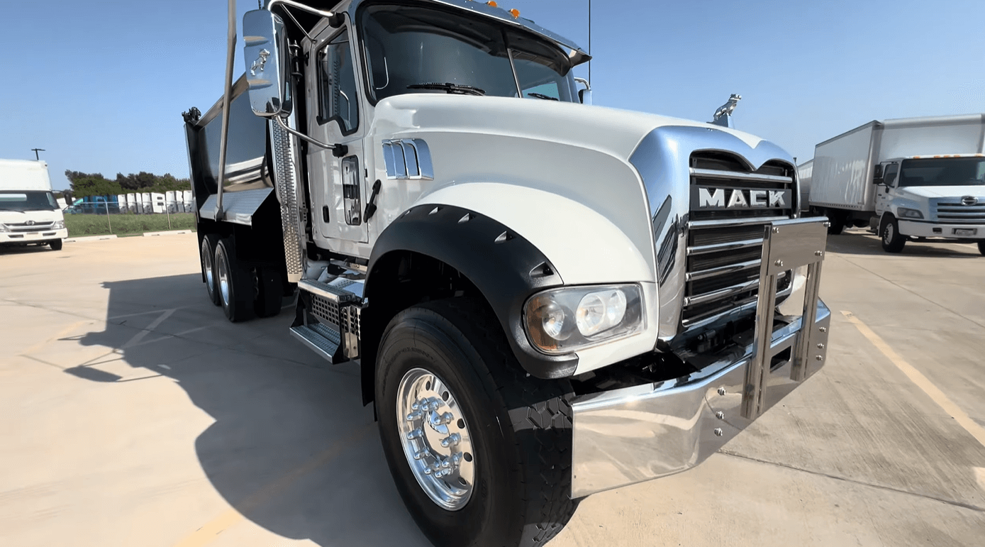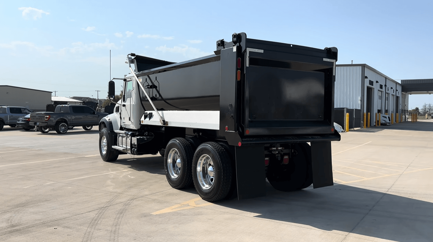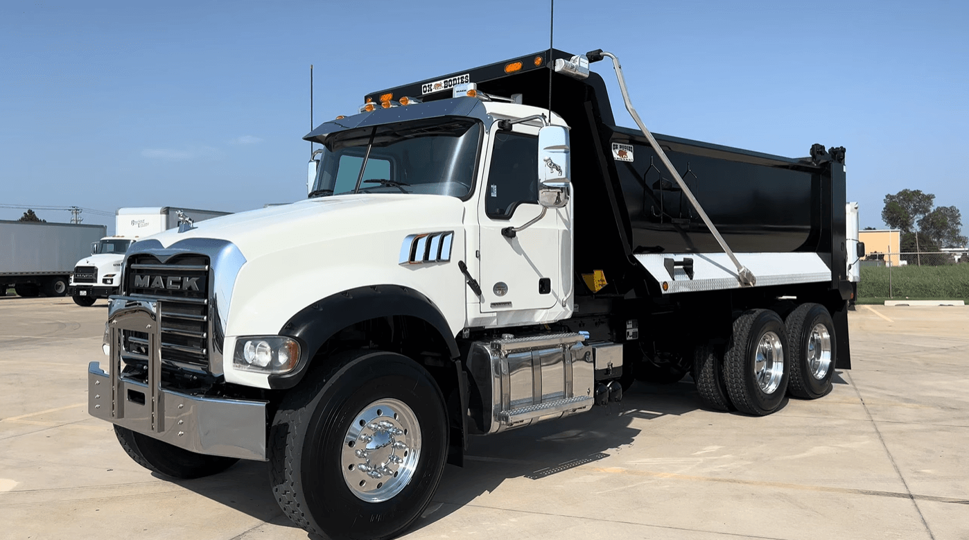 Low mileage on this pair of MP8/Allison powered 2022 Mack GR64F tandem axle dump truck with only 65k miles and 16ft/20yd OX Bodies 1/2 round dump body.