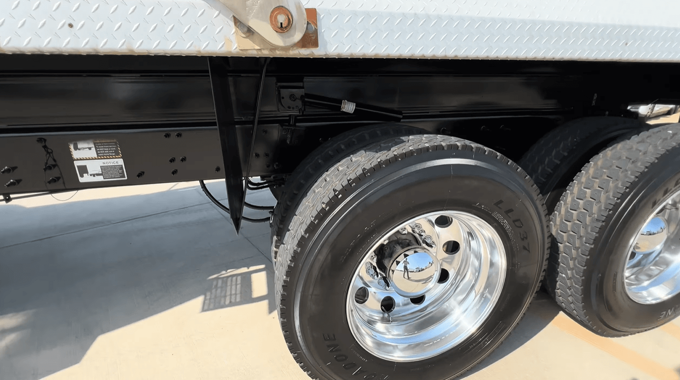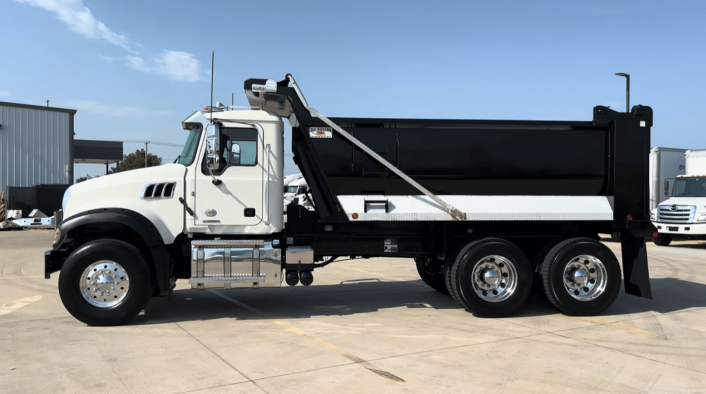 Low mileage on this pair of MP8/Allison powered 2022 Mack GR64F tandem axle dump truck with only 65k miles and 16ft/20yd OX Bodies 1/2 round dump body.